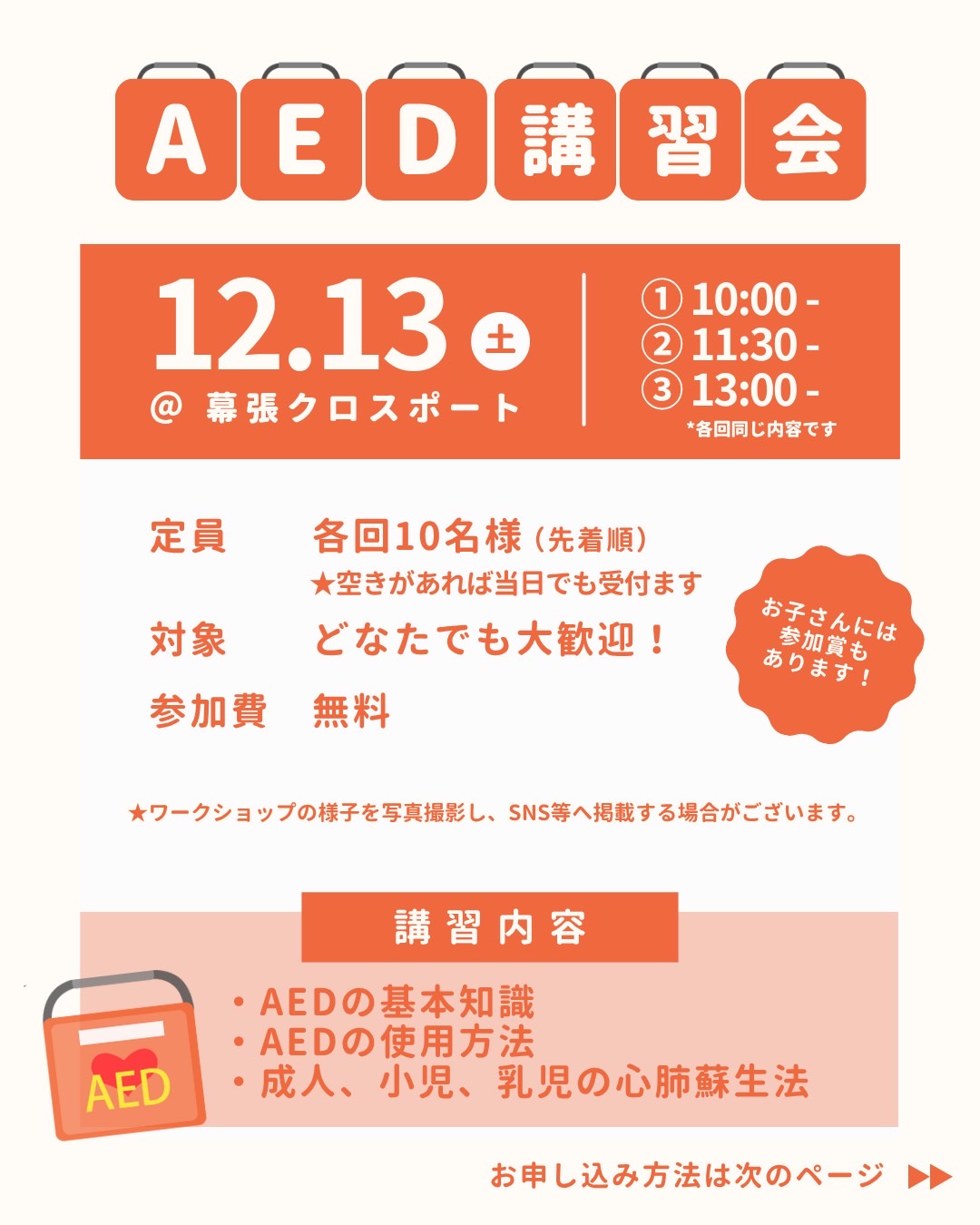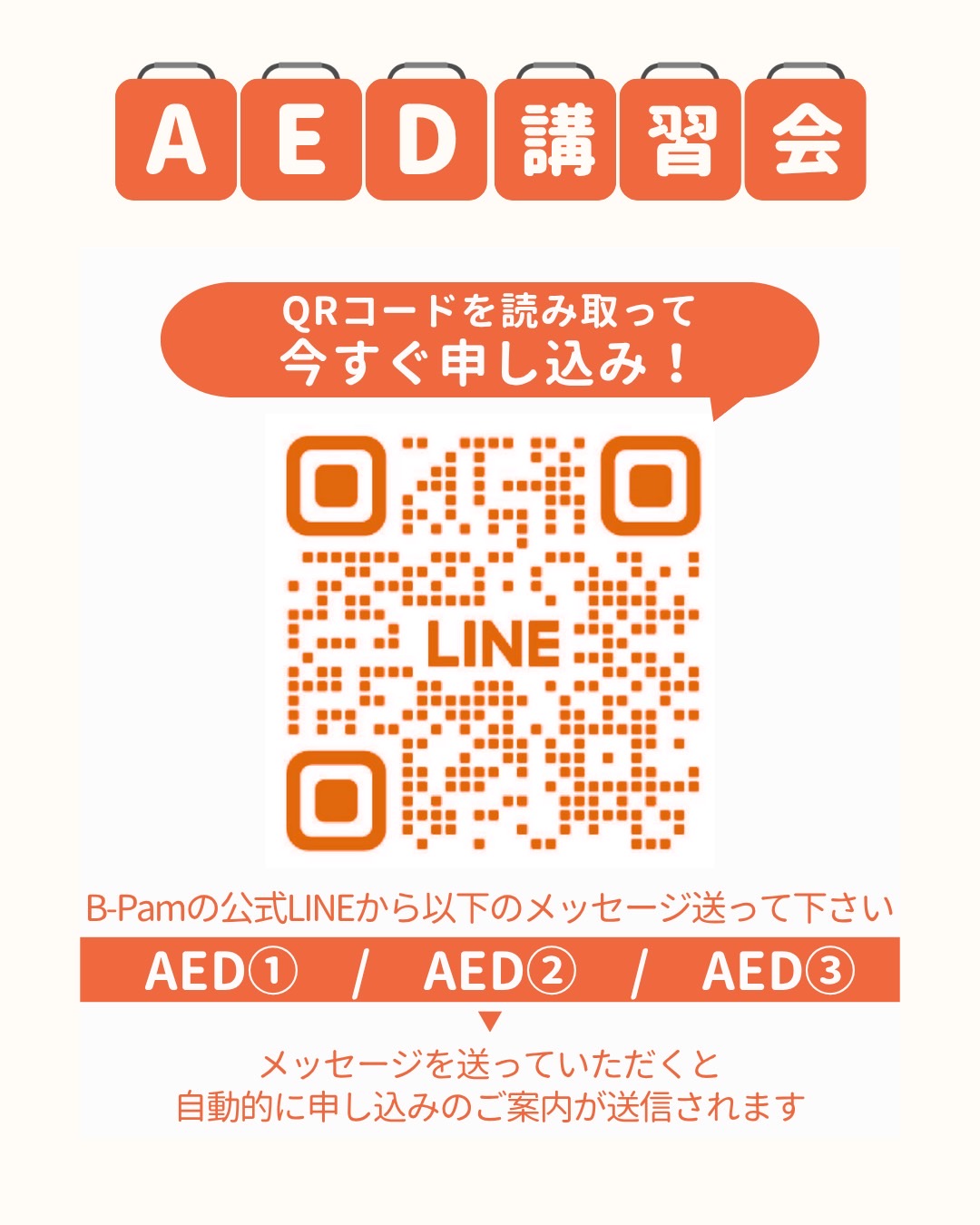 | B-Pamスクール みんなで学ぼう! 命を救うAED講習会 昨年も好評だった本スクール、 今年の開催も決まりました! 大切な人の命を守るチャンス 幕張ベイパークの安全・安心を支える協和警備保障株式会社が 実践的なAED講習会を開催します。 【講習内容】 ・AEDの基本知識 ・AEDの使用方法 ・成人、小児、乳児の心肺蘇生法 【日時】 12月13日(土) ①10:00 ②11:30 ③13:00 (各回の内容は同じです) 【場所】 幕張クロスポート 【定員】 10名様(先着順) ★空きあれば、当日でも受付ます 【募集対象】 どなたでも大歓迎 【参加費】 無料 ★お子さんには参加賞あり 【注意事項】 ワークショップの様子を写真撮影し、SNS等に掲載する場合がございます。 ご了承のうえお申込ください。 【申込方法】 B-Pamの公式LINEからお申し込みください。 『AED①』、『AED②』、『AED③』とメッセージを頂くと、自動的に申込のご案内が送信されます。 ★本講習会は、地域の店舗の方がB-Pamスクール支援金を活用して運営するオープンスクールです。 |