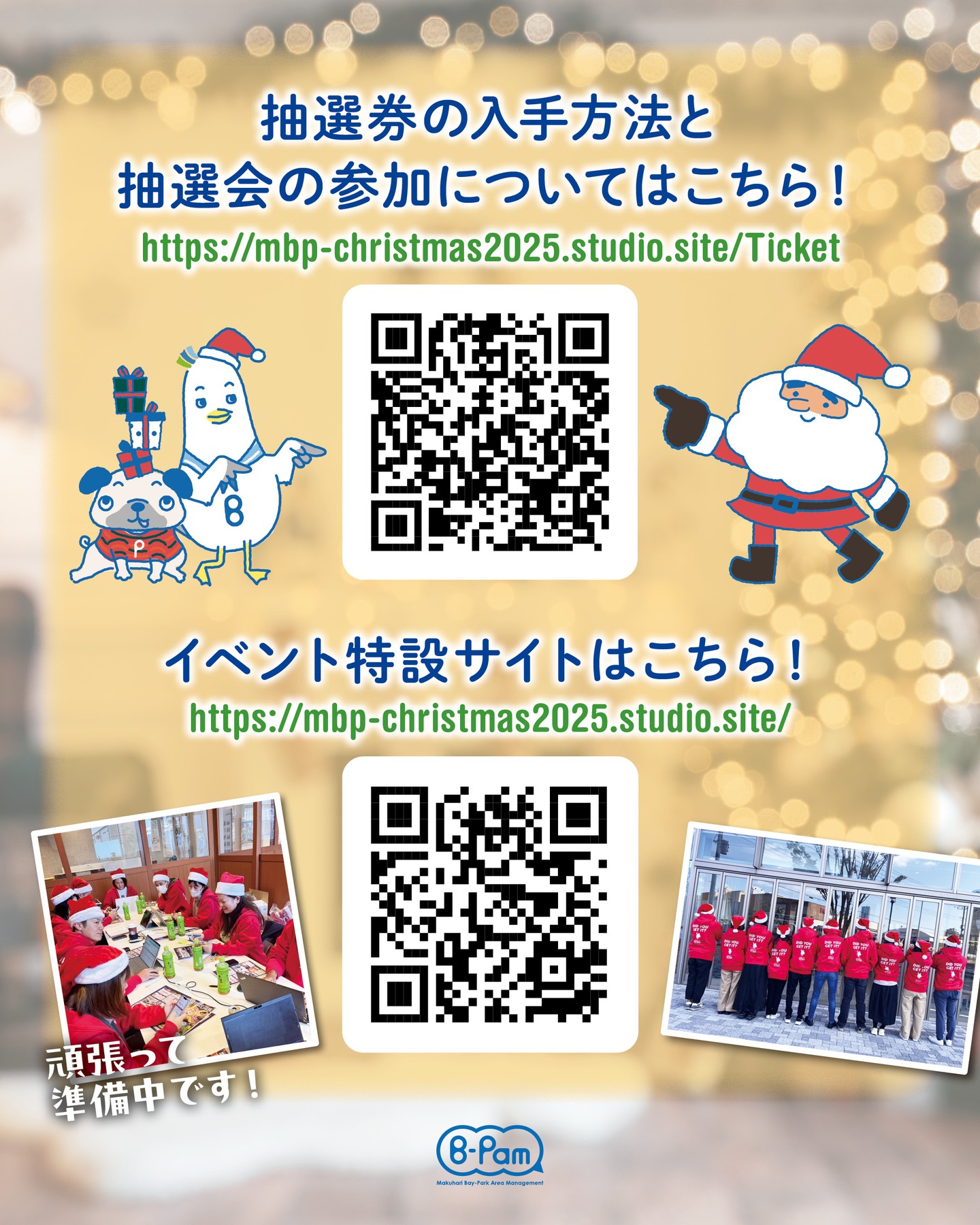 | MAKUHARI BAY-PARK CHRISTMAS 2025 もらった?サンタのプレゼント 本日、クリスマスイベントのチラシが投函されました! ぜひご覧ください!! 「あれ?今年のチラシには抽選券がついていない?」 と思った方も多いかもしれませんが… はい、今年はチラシと一緒に抽選券をポスティングしておりません! 抽選券は、チラシに掲載された“入手方法”からゲットしてくださいね♡ 「どうしてチラシと一緒に配らないの?」 という質問が聞こえてきそうですが… それにはサンタさんからのリクエストがありました。 抽選会に参加してくれる方に、ちゃんと抽選券を届けたいのじゃ 抽選会の会場までに、わしに会いに来てほしいのじゃ わしの大好きな、こどもだけ対象の抽選会もやりたいのじ⇦ とのことです。 ぜひあの手この手で抽選券をたくさんゲットして、 サンタさんからプレゼントをもらってくださいね! イベントの特設サイトは 画像のQRコードからいけます、 ぜひご覧ください。 |