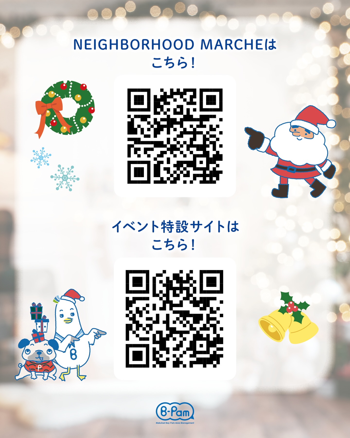 | MAKUHARI BAY-PARK CHRISTMAS 2025 もらった?サンタのプレゼント 毎年クリスマスイベントの日に開催しているクリスマスマーケットが、今年はなんと…合同会社 prove LiFE さんとのコラボ開催にパワーアップします! 今回は 【12月13日・14日の2日間連続開催】となります! 詳細はこちらからご覧ください @neighborhood_marche 画像で紹介してるお店はほんの一部になります。 心ときめくアイテムやフードがずらりですね 「あれもこれも欲しい…!」 「色々食べてみたい…!」 なんて、きっと迷ってしまいます!! ぜひ思いきりお買い物や飲食を楽しんでください。 というのも―― お支払金額に応じて、クリスマス《大抽選会》の抽選券がもらえるんです! しかも【1,000円ごとに1枚】プレゼント!! 1会計につき ・1,000円なら → 抽選券1枚 ・2,300円なら → 抽選券2枚 ・5,900円なら → 抽選券5枚 ……というイメージです。 買えば買うほど、食べれば食べるほど当選のチャンスもどんどんアップ 是非会場でお気に入りをたくさん見つけて、素敵なクリスマスギフトとワクワクの景品、両方ゲットしちゃいましょう。 心もお腹も満たされる二日間をお楽しみ下さい。 ※抽選券はなくなり次第配布終了します。 |